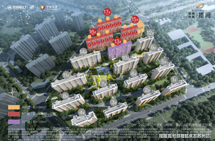 【招商中旅·揽阅】共计规划17栋12-14F小高层,首开楼栋位于整个项目的北侧,共3种户型,分别为建面约96㎡三房两卫、建面约104㎡三房两卫、建面约135㎡四房两卫。3种户型提供了全生命周期成长空间的方案。
